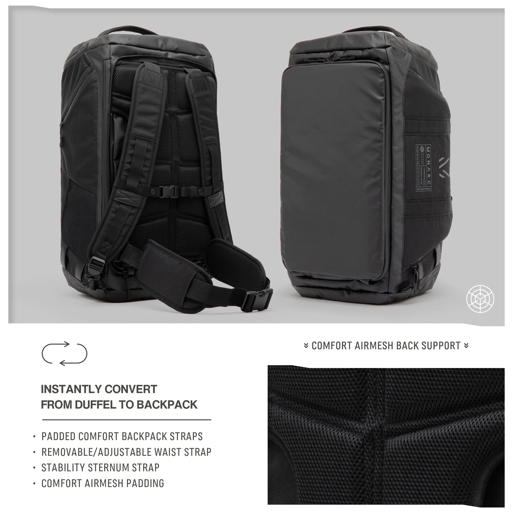 - The backpack system features a luggage pass-through securing the duffel to rolling luggage.