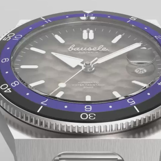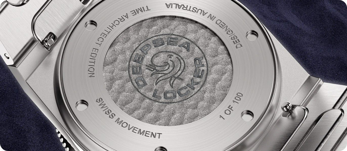Engraved with an underwater sand texture motif. Crafted from 316L surgical-grade stainless steel with a brushed finish. 100 first limited edition watches individually numbered.