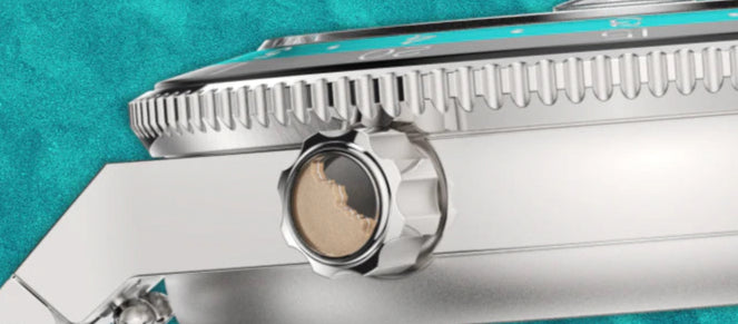Screw-down crown filled with real sand from the Northern beaches of Sydney, visible through a transparent crown cap.