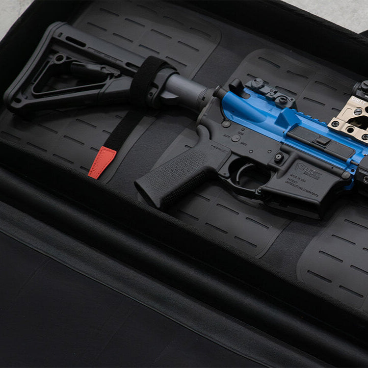 The case’s two external YKK Aquaguard® zippers are extremely rugged and include easy-grip 550 cord pulls that are reinforced with heat shrink wrap. The case has a MOLLE-style base and includes four reconfigurable DAKA Gear Straps to secure a rifle, MOLLE-compatible pouches, or other gear. The interior of the lid features three stretchable mesh pockets to hold up to six PMAG® LR/SR GEN M3 sized magazines, a mesh organizational pocket for small items, and a zippered pocket for accessories and documents such as NFA paperwork, targets, manuals, and other important materials.