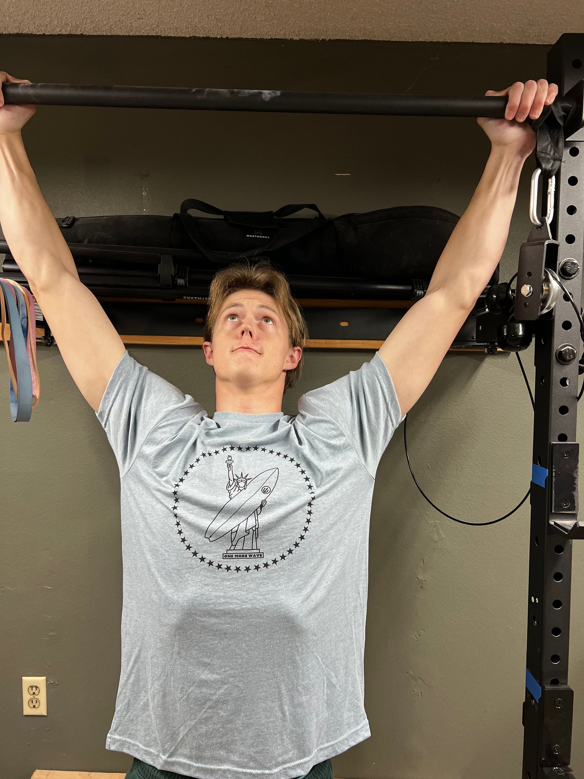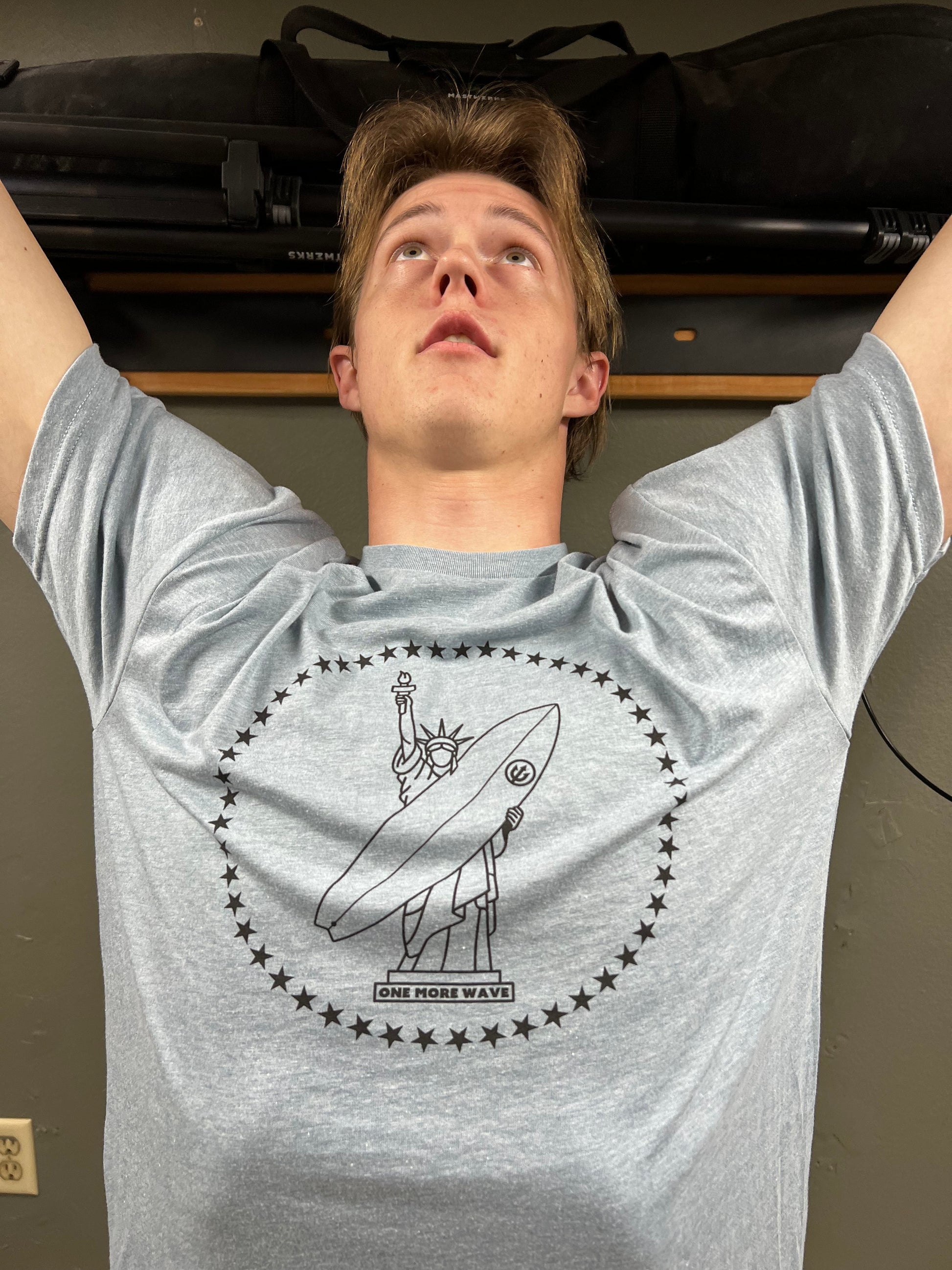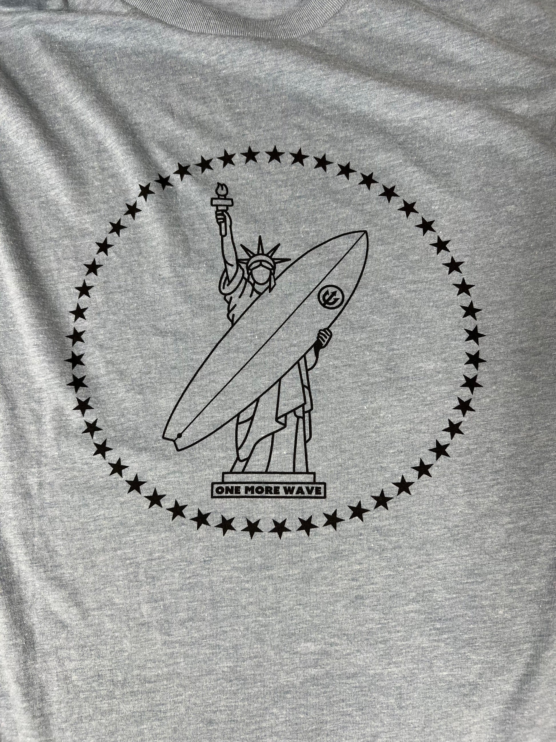 At the center of the design stands Lady Liberty, the iconic symbol of the United States, holding her torch high in one hand, illuminating the path to liberty and justice for all. In her other hand, she confidently wields a surfboard, representing the boundless passion for the ocean and the exhilarating sport of surfing. 100% of the proceeds from the sale of each Lady Liberty Surf T-Shirt go directly to One More Wave, a nonprofit organization dedicated to providing custom surfboards to wounded veterans, allowing them to find healing and joy in the waves.