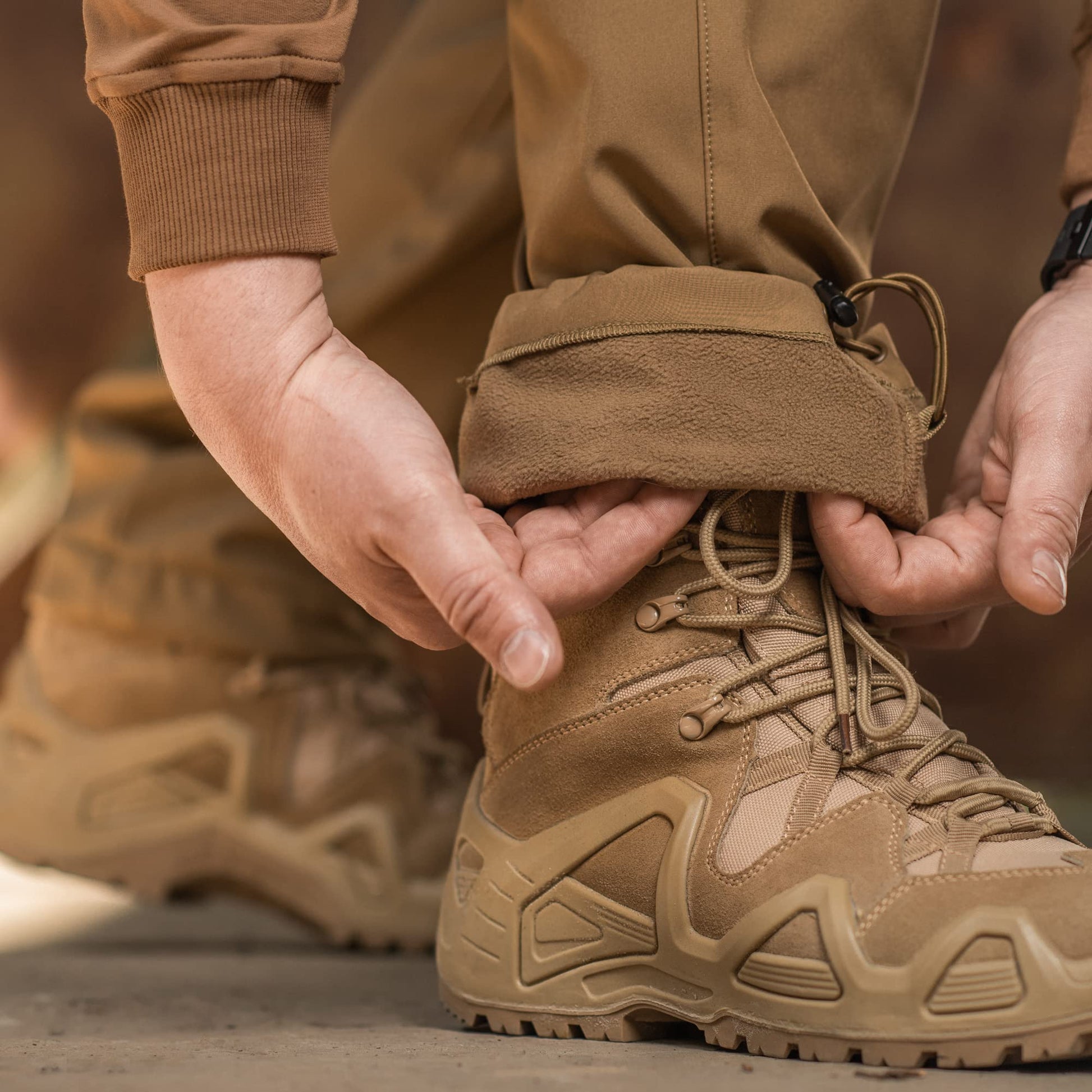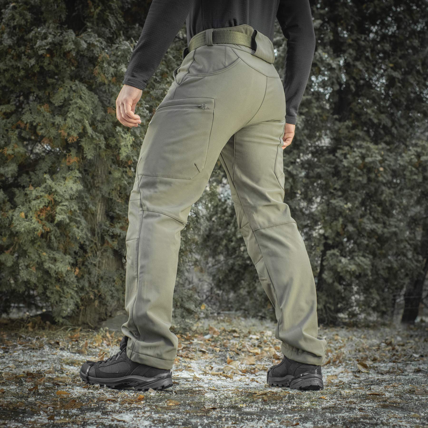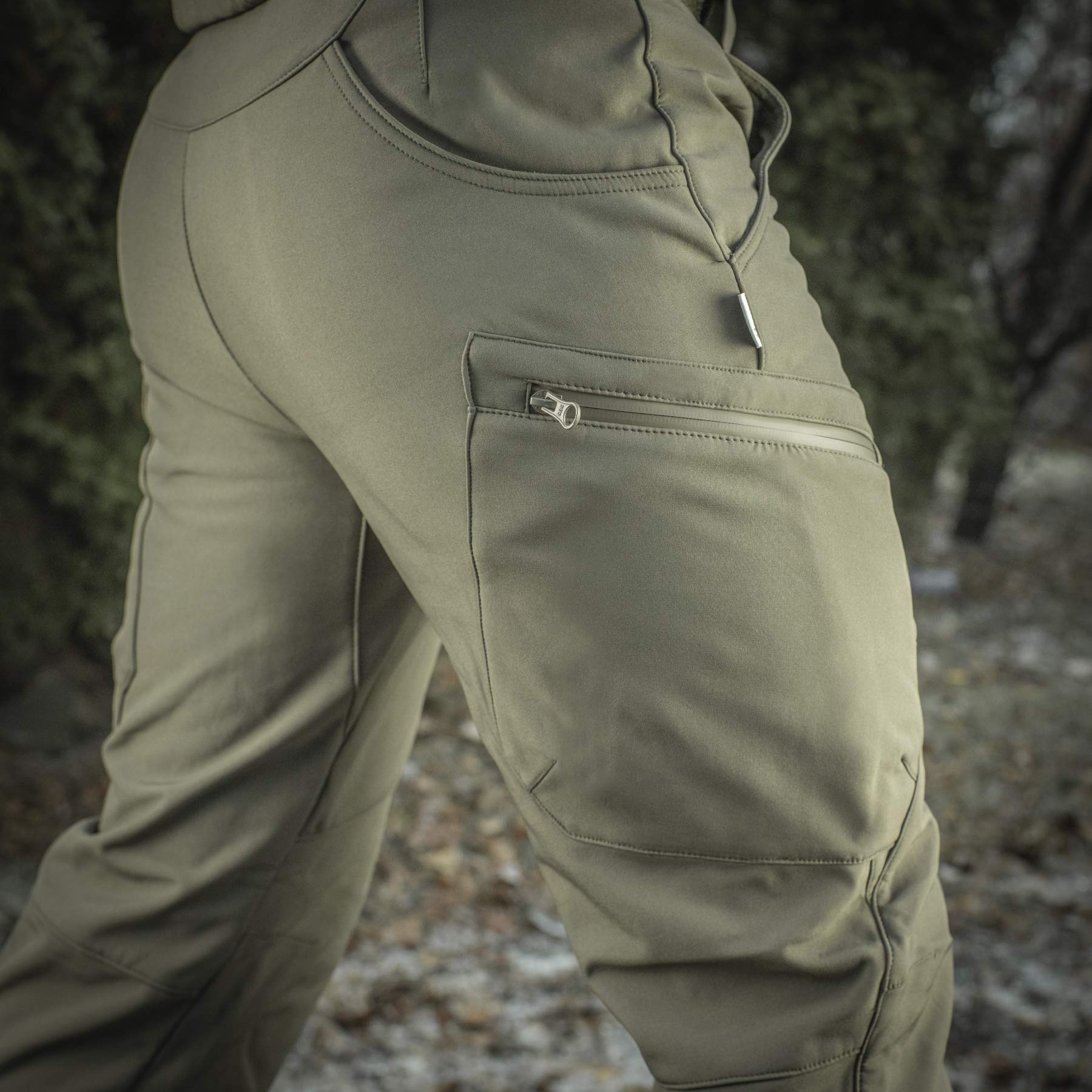 The M-Tac Soft Shell Winter tactical pants. The softshell fabric combines heat-insulating and "breathable" properties of fleece with wind and moisture resistance and strength of the outer layer. The outer surface blocks the wind, and the inner layer of the fabric wicks away excess moisture. It is used as a top layer in the off-season and in winter. For additional comfort in cold periods of the year, the manufacturer added a fleece lining to these tactical snow pants. The soft-shell fleece-lined insulated pants are ideal for winter activities, range training, or everyday tactical wear.