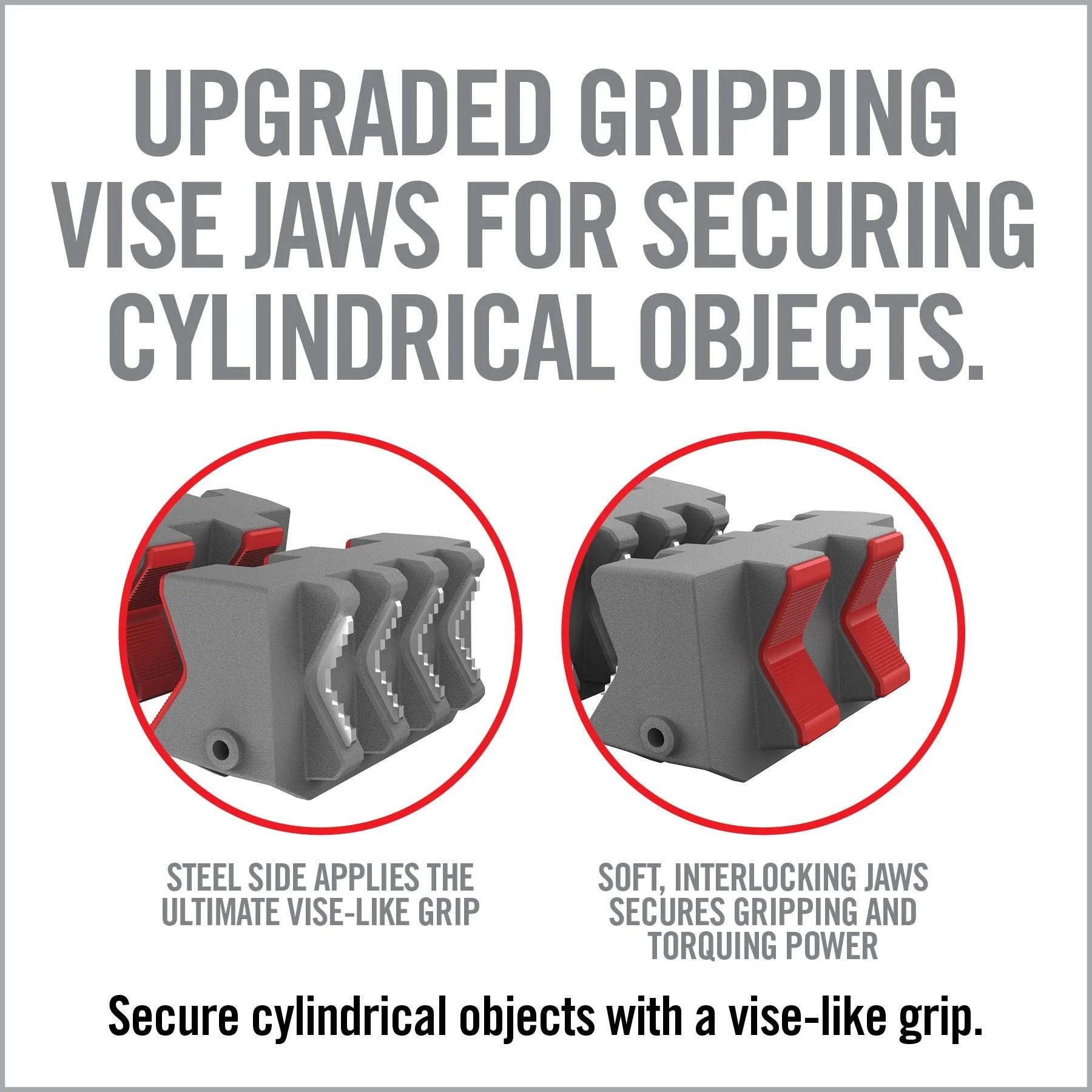 Securing cylindrical objects can be difficult and frustrating without the right tool for the job. Smart-Jaws Tube-Fit Sleeves are engineered to provide a secure grip on suppressors, PVC and cast-iron pipe, and all types of tubing, and are two-sided to best fit the application. For delicate items such as suppressors, the non-marring, soft jaws apply ample gripping and torquing power to loosen the tightest fits without damaging your investment. For tough jobs when marring is not an issue, such as with cast-iron pipe or steel tubing, simply reverse the jaws to the steel side for the ultimate vise-like grip.
