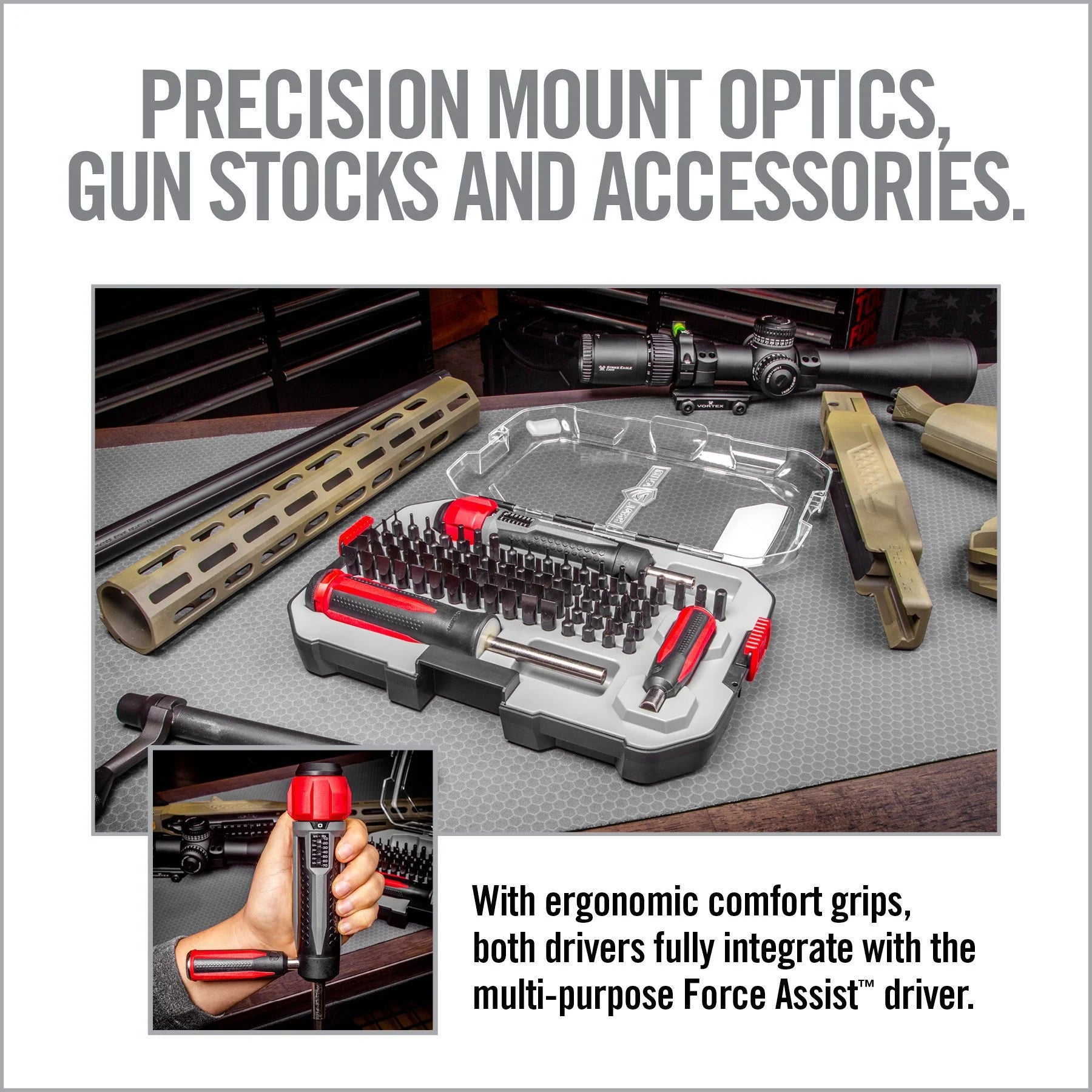 This intelligently designed Master Set includes both the Smart-Torq® and Smart-Drive® gunsmithing drivers. With ergonomic comfort grips, both drivers fully integrate with the multi-purpose Force Assist™ driver. Smart-Torq features easy to see and set 1 in-lb increments. For non-torque applications the Smart Drive will be your go-to for not only gunsmithing work, but any tasks around the house or shop. Smart-Drive has a free spinning cap for applying additional downward pressure and an LED light for dark spaces. Completing the set are 83 standard and metric black oxide coated gun bits. Gun bits are hollow ground and square cut for precise fitment.