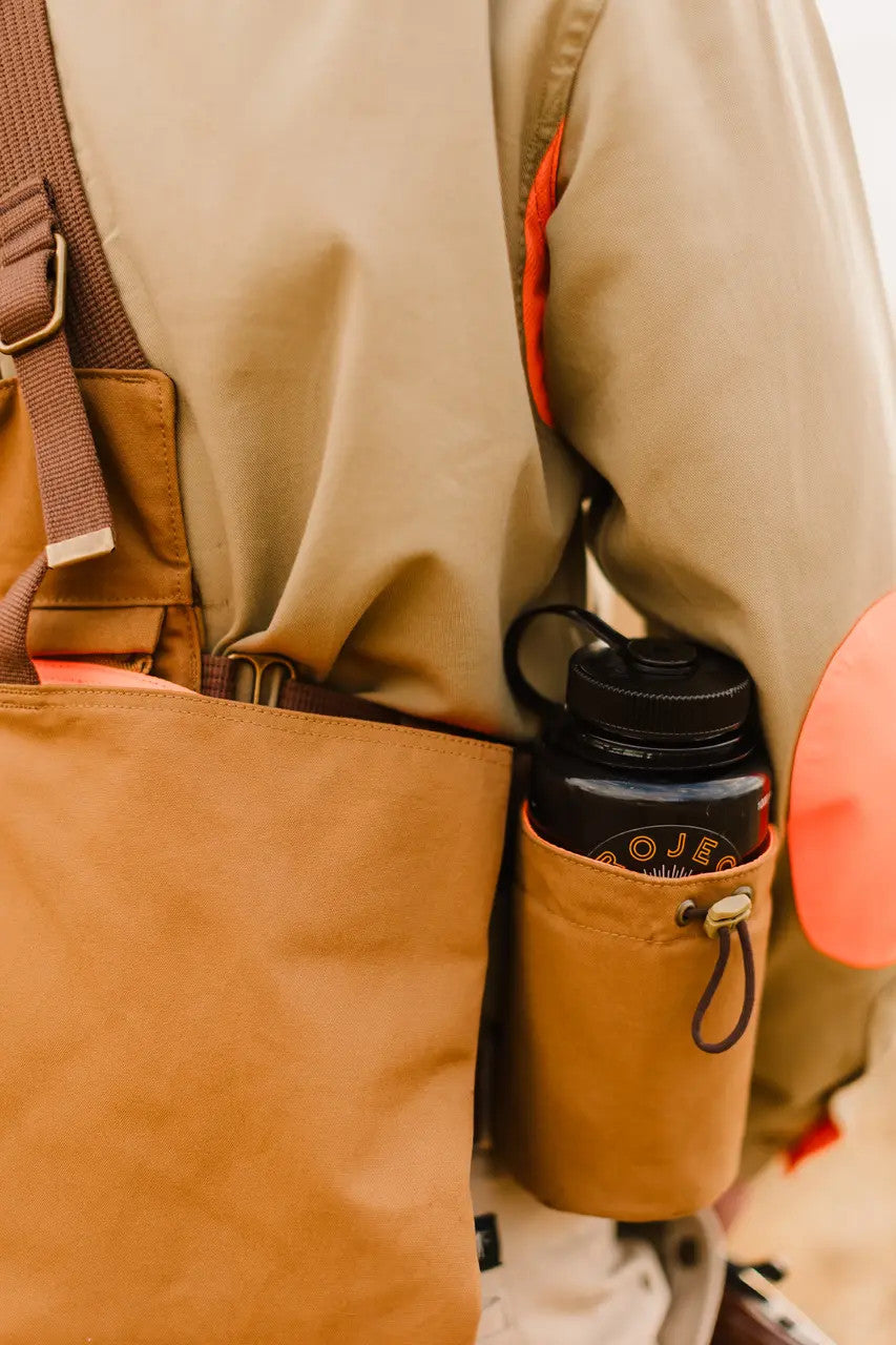 The Ball and Buck strap vest is hand-crafted from ultra-premium materials including our signature 12.29oz military canvas, 100% cotton webbing, breathable mesh, and adorned with solid brass zippers, snaps, and hardware. The vest features YKK water repellant concealed stash pockets behind the front draining shell pockets, a large and functional removable water repellant game pocket, an integrated hydration reservoir with attachment points for the hydration tubing, two removable water bottle/ gear holders, double D-rings for calls or tool attachment, and the vest is adjustable both on the sides and in the front for fine tuning the fit. The vest is available in two sizes and two versions–one focused on upland hunting and one focused on dove/waterfowl hunting.