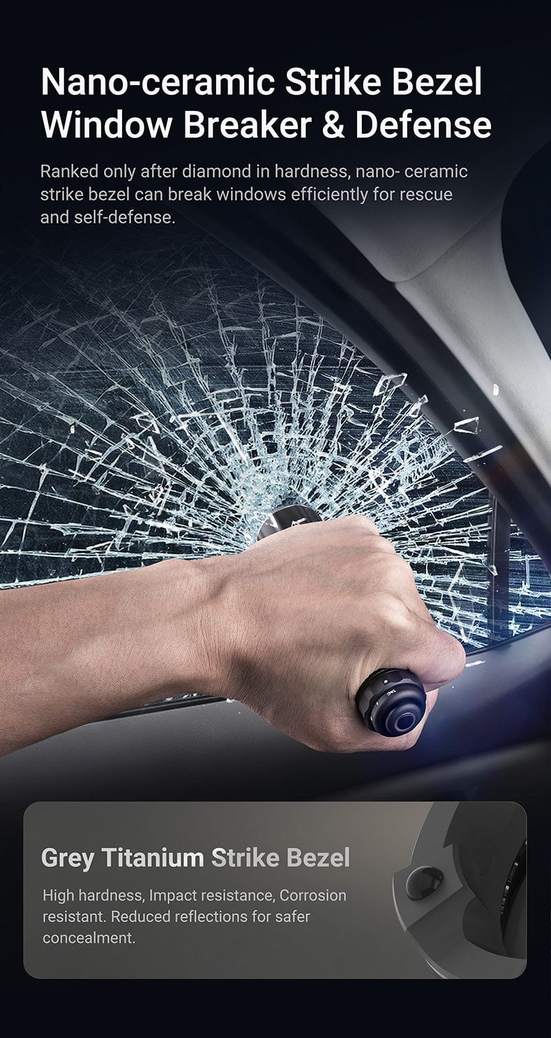 Ceramic Strike Bezel: Reinforced with three nano-ceramic beads capable of shattering glass or delivering devastating strikes in close-quarters. Whether you’re escaping a vehicle after a rollover or defending against a close-range threat, this bezel turns your light into a formidable impact tool.