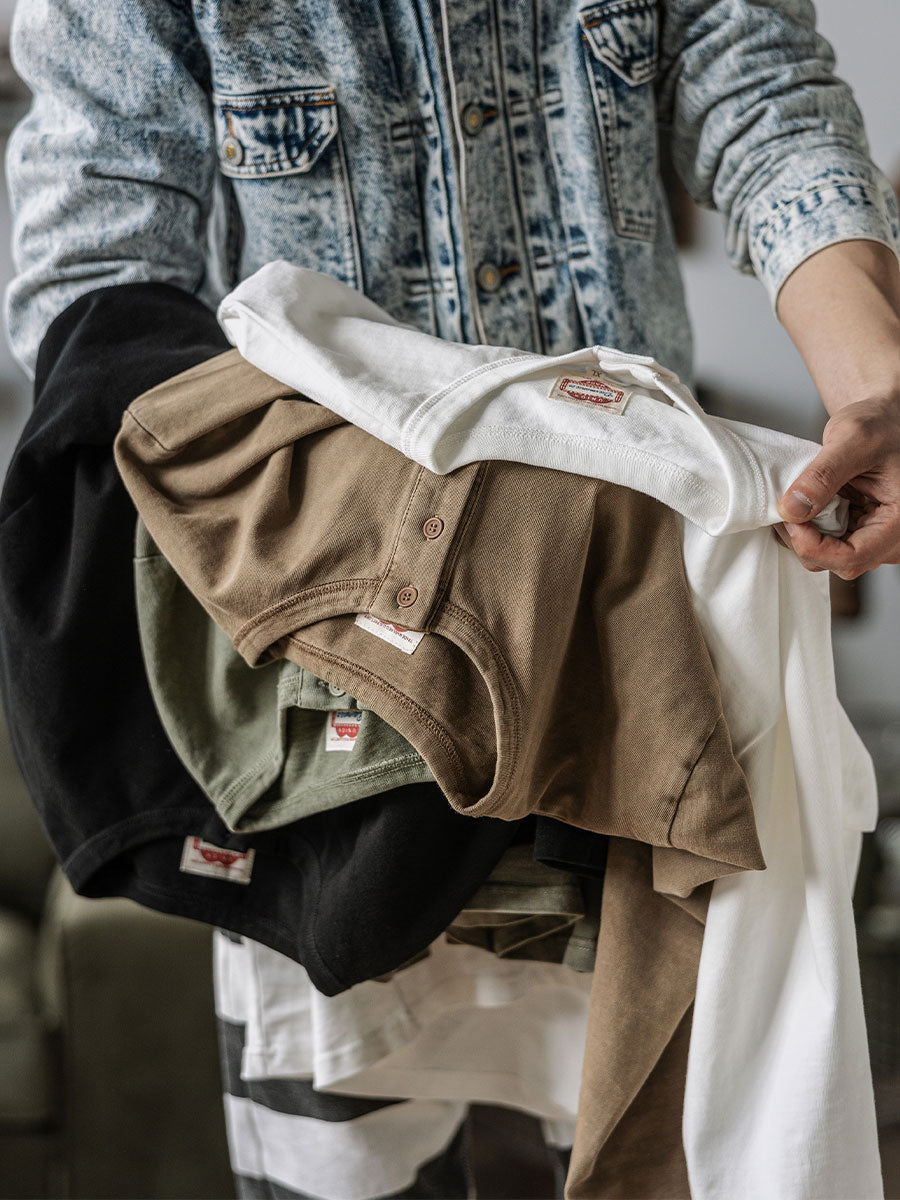This Henley is 3 buttons style, made of heavyweight 12.3 oz. cotton fabric, standard fit, not too tight, not too loose, easy throughout the body, has a great texture, is comfortable to wear, and will look more retro after long wear and multiple washes.