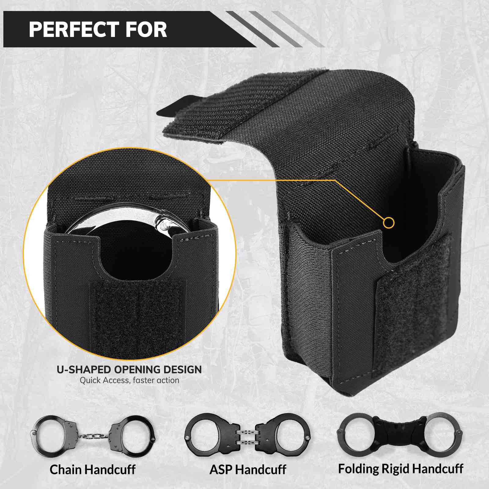 - Universal Handcuff Pouch – Crafted from durable 500D nylon, this versatile handcuff holster fits a wide range of cuffs, including ASP, Hinged, Chain, and Folding Rigid Handcuffs. Also great for holding field compasses, small tools, and other essentials.